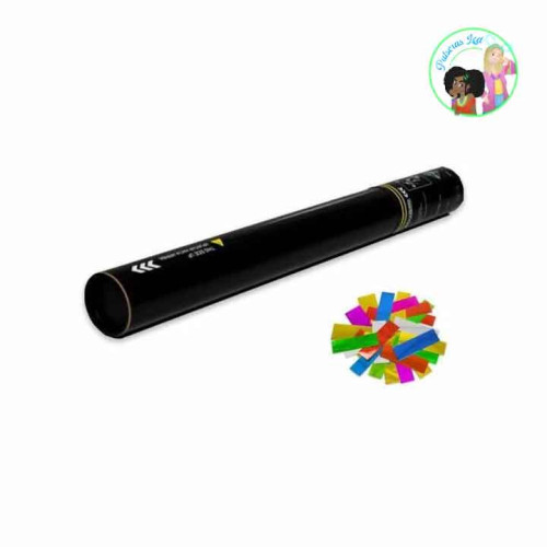 - Cañón de 30 cm: Ideal para espacios pequeños, dispara hasta 4 metros de altura con 60 gramos de confeti metalizado.